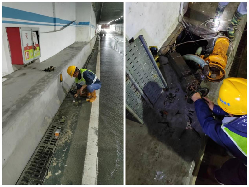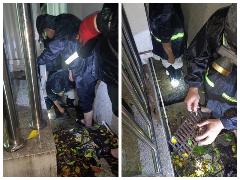(組織職工冒雨開展園區(qū)內所有下水道清淤工作)