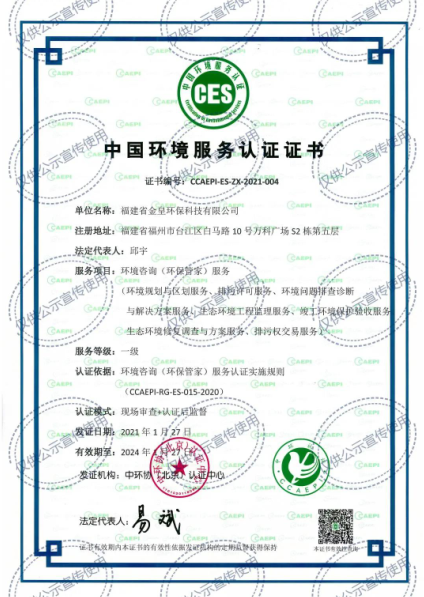 繼2019年末成為全省首家榮獲中國環(huán)境保護產(chǎn)業(yè)協(xié)會AAA信用評級環(huán)保咨詢類企業(yè)之后,1月27日,金皇環(huán)保成為全省首家通過環(huán)境咨詢(環(huán)保管家)服務(wù)中國環(huán)境服務(wù)認(rèn)證的企業(yè),服務(wù)等級為一級。