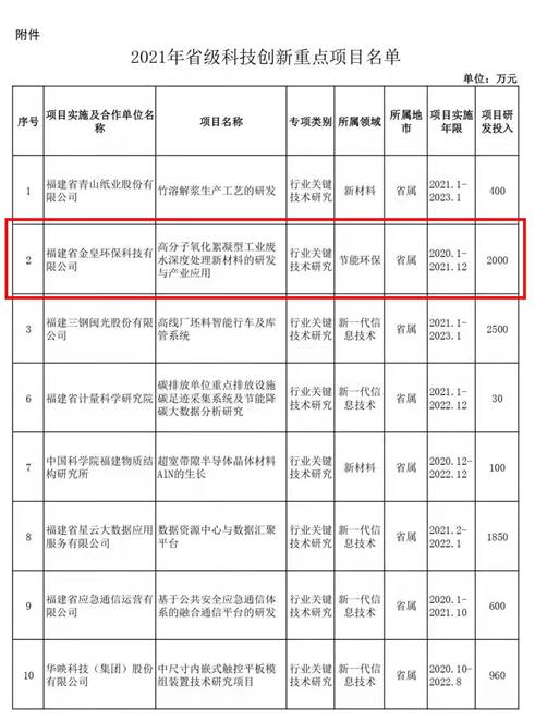 近日,福建省工業(yè)和信息化廳以《閩工信函科技〔2021〕476號》文發(fā)布了《關于印發(fā)2021年省級科技創(chuàng)新重點項目的通知》,金皇環(huán)保自主研發(fā)項目“高分子氧化絮凝型工業(yè)廢水深度處理新材料的研發(fā)與產業(yè)應用”成功入選。
