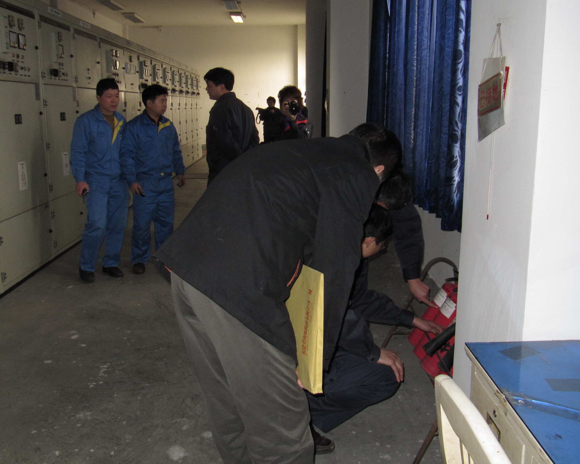 上圖為檢查組在青山紙業(yè)低壓室檢查滅火器情況