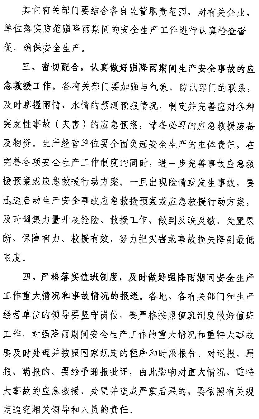 現(xiàn)將《福建省人民政府安全生產(chǎn)委員會(huì)關(guān)于切實(shí)做好防范強(qiáng)降雨期間全省安全生產(chǎn)工作的緊急通知》(閩安委辦明電[2010]14號(hào))轉(zhuǎn)發(fā)給你們。各企業(yè)要從思想上高度重視,認(rèn)真貫徹落實(shí)《通知》要求,加強(qiáng)領(lǐng)導(dǎo),強(qiáng)化責(zé)任制落實(shí),做好值班安排,加強(qiáng)巡查,及時(shí)排查和整改隱患,切實(shí)采取有效防范措施,做好強(qiáng)降雨期間的安全生產(chǎn)工作。