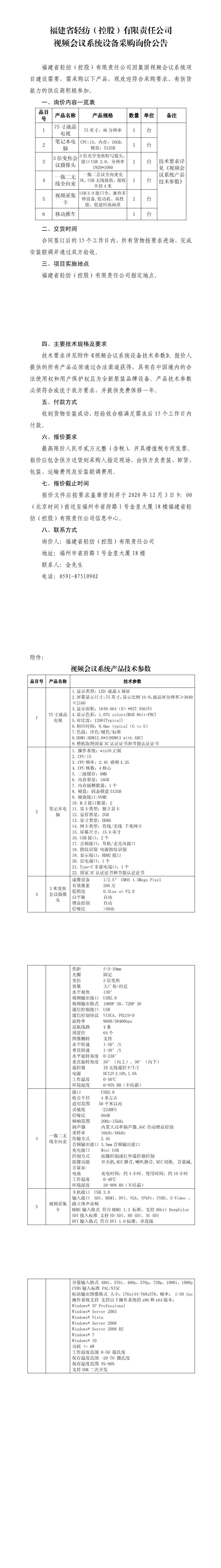 福建省輕紡(控股)有限責(zé)任公司 視頻會議系統(tǒng)設(shè)備采購詢價公告