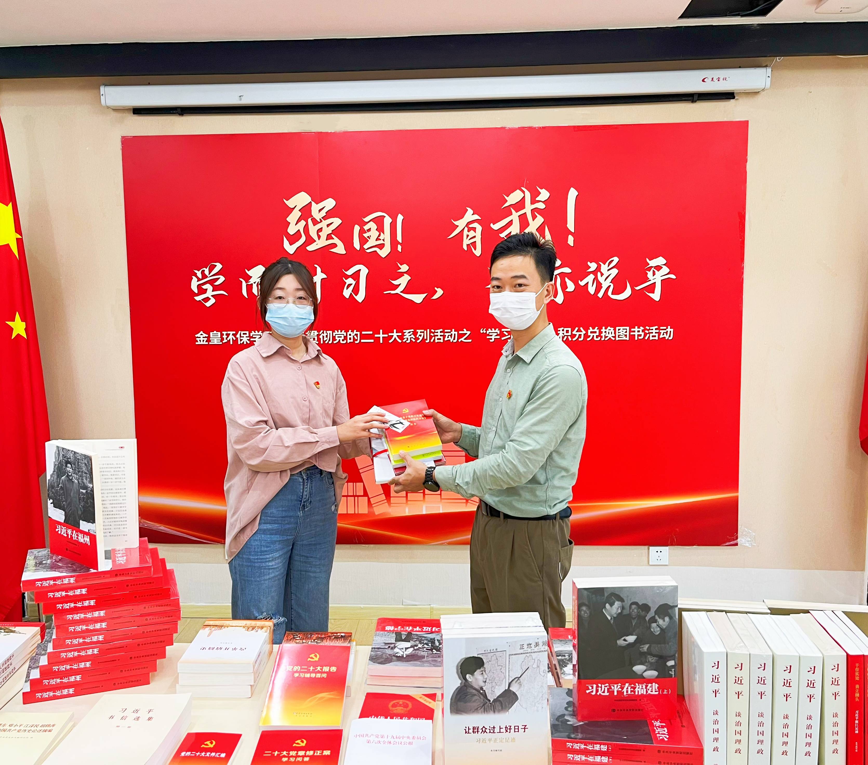 書香融融,笑語氤氤。為學(xué)習(xí)宣傳貫徹黨的二十大精神,創(chuàng)新“學(xué)習(xí)強(qiáng)國”學(xué)習(xí)組織形式,推動(dòng)政治理論學(xué)習(xí)常態(tài)化、意識(shí)形態(tài)宣傳及推動(dòng)黨建品牌建設(shè)工作規(guī)范化。11月29日,金皇環(huán)保黨總支組織開展學(xué)習(xí)宣傳貫徹黨的二十大系列活動(dòng)之“學(xué)習(xí)強(qiáng)國”積分兌換圖書活動(dòng)。