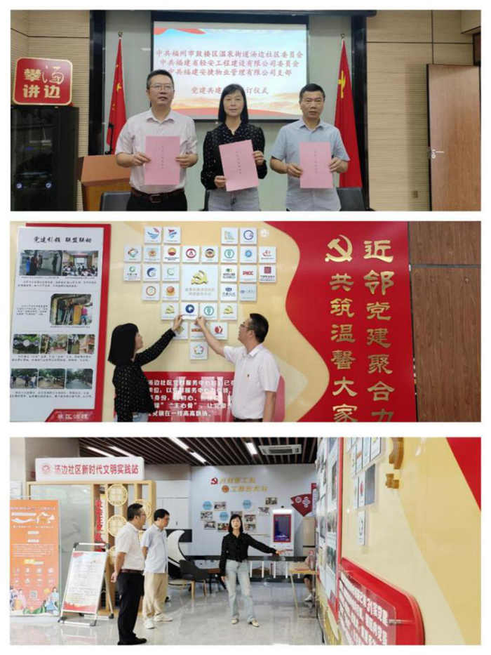 為深入學(xué)習(xí)貫徹習(xí)近平新時代中國特色社會主義思想和黨的二十大、黨的二十屆三中全會精神,切實推動精神文明創(chuàng)建和單位文化建設(shè),構(gòu)建基層黨組織共建、各方黨員參與、共同提升黨建工作水平的新格局,經(jīng)各方黨組織協(xié)商一致,中共福建省輕安工程建設(shè)有限公司委員會、中共福州市鼓樓區(qū)溫泉街道湯邊社區(qū)委員會、中共福建安捷物業(yè)管理有限公司支部于2024年9月27日上午在溫泉街道湯邊社區(qū)簽訂三方黨建共建協(xié)議,正式結(jié)成黨建工作聯(lián)盟單位。